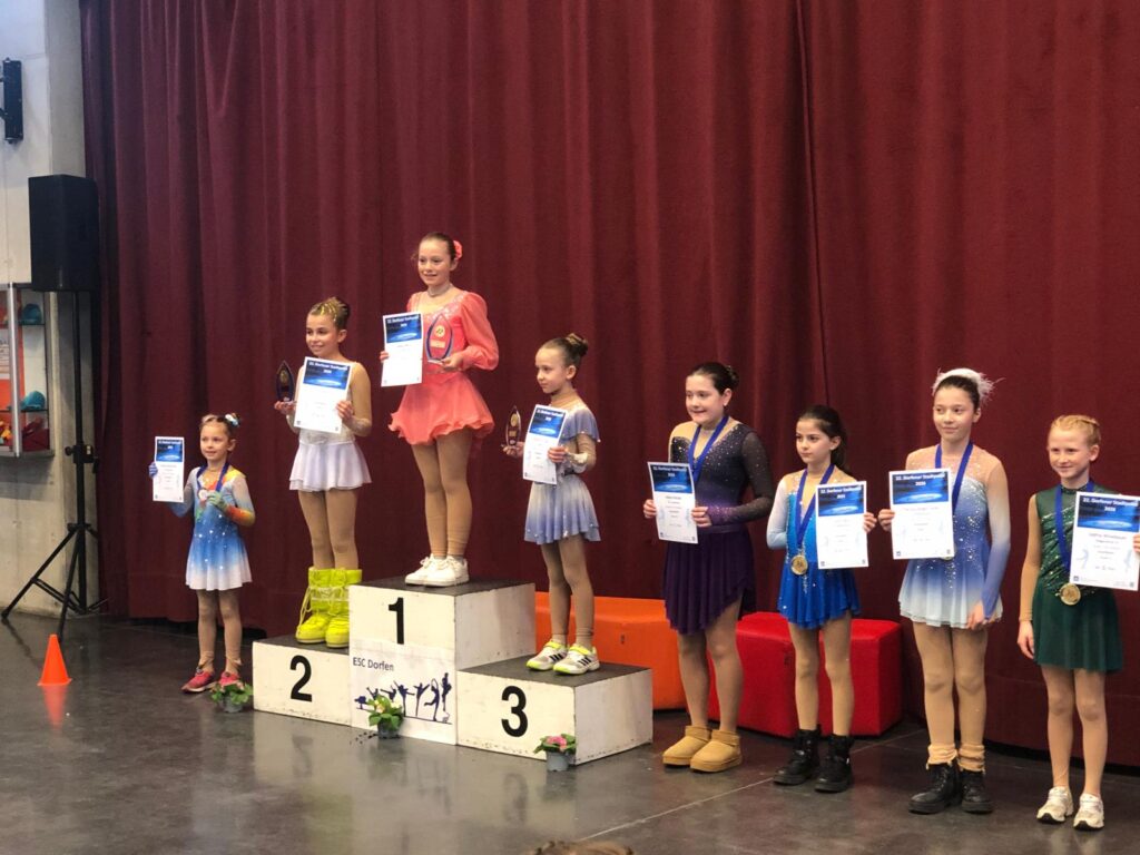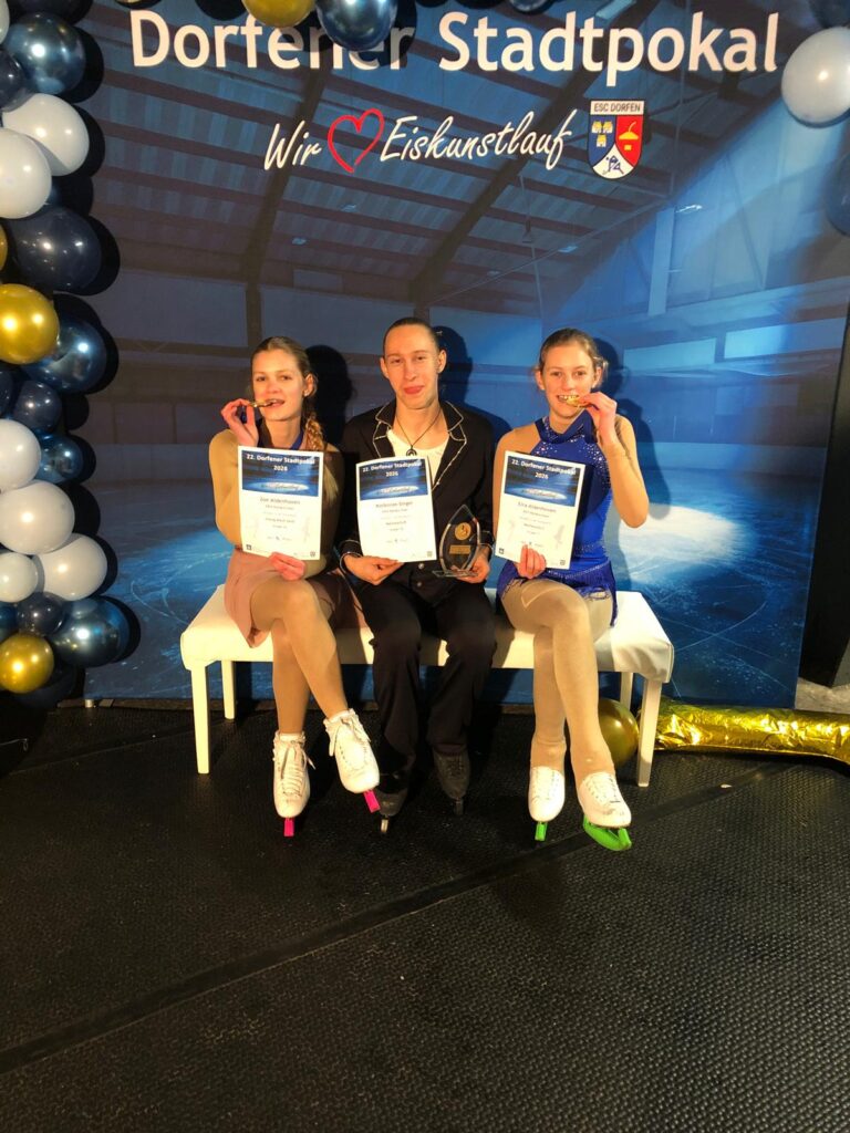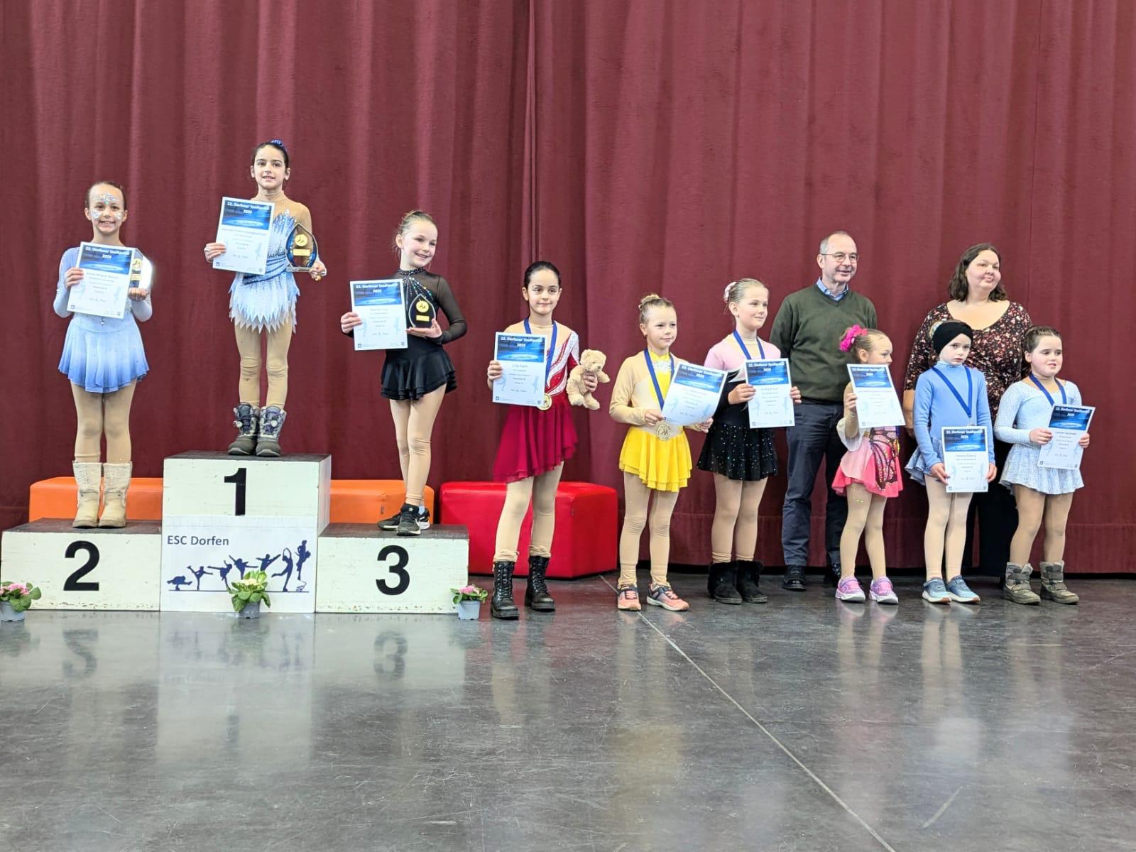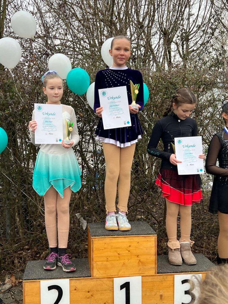 Auf dem 22. Dorfener Stadtpokal am 7. Februar 2026 haben sich drei unserer Läuferinnen und Läufer den ersten Platz ergattert! Hannah Freire-Stoegbuchner (Elemente III 5a), Jelena Wicht (Kunstläufer 7a) und Korbinian Singer (Nachwuchs B Jungen) standen alle ganz oben auf dem Treppchen. Auch dabei waren Lara Obermüller (Elemente III 5a, 5. Platz), Mila Obermüller (Elemente IV 2b, 10. Platz), Nele Fischhaber (Elemente IV 2c, 4. Platz), Zoe Aldenhoven (Young Adult Gold, 4. Platz) und Eira Aldenhoven (Nachwuchs C, 7. Platz).